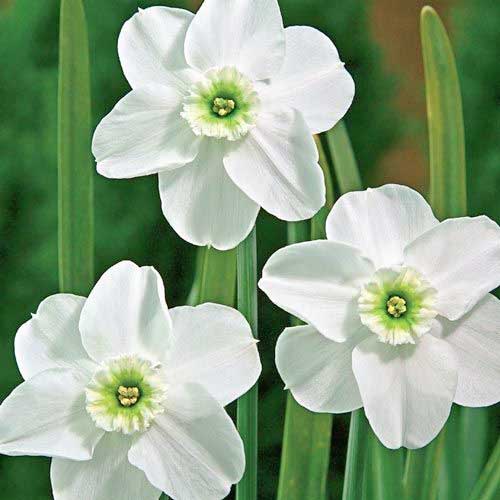 Растение среднего размера (до 45 см), с ярко-зелеными листьями. На верхушках цветоносов образуются очаровательные бутоны размером до 8 см. В распустившемся виде диаметр цветков равен 10 см. Лепестки окрашены в белоснежный цвет. Коронка пастельно-зеленая, невысокая (1/3 длины околоцветника). Период цветения начинается в апреле или мае, в зависимости от региона, и длится до 2 недель. Изящные цветы роскошно смотрятся в составе букетных композиций, в контейнерах, на клумбах и рабатках.
