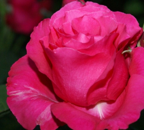 Кустарник вырастает высокорослым (в пределах 1,2 м), с крепкими и длинными отростками-цветоносами. К 4-летнему возрасту его диаметр равен 1 м. Побеги покрыты небольшим количеством шипов, выступающих вверх на 6 – 7 см. Листья насыщенно-зеленого цвета. Бутон махровый (состоит из 30 лепестков), аккуратной бокаловидной формы. Раскрывается он всего на ¾ объема, но даже в таком виде ширина цветка равна 12 см. На стеблях образуется по 1 – 2 бутона. Длина цветущего побега составляет около 70 см. Лепестки малиново-розового цвета, бархатные с внутренней стороны и гладкие снаружи. Цветение начинается во второй половине июня и продолжается до глубокой осени. Роза источает пряно-интенсивный аромат.